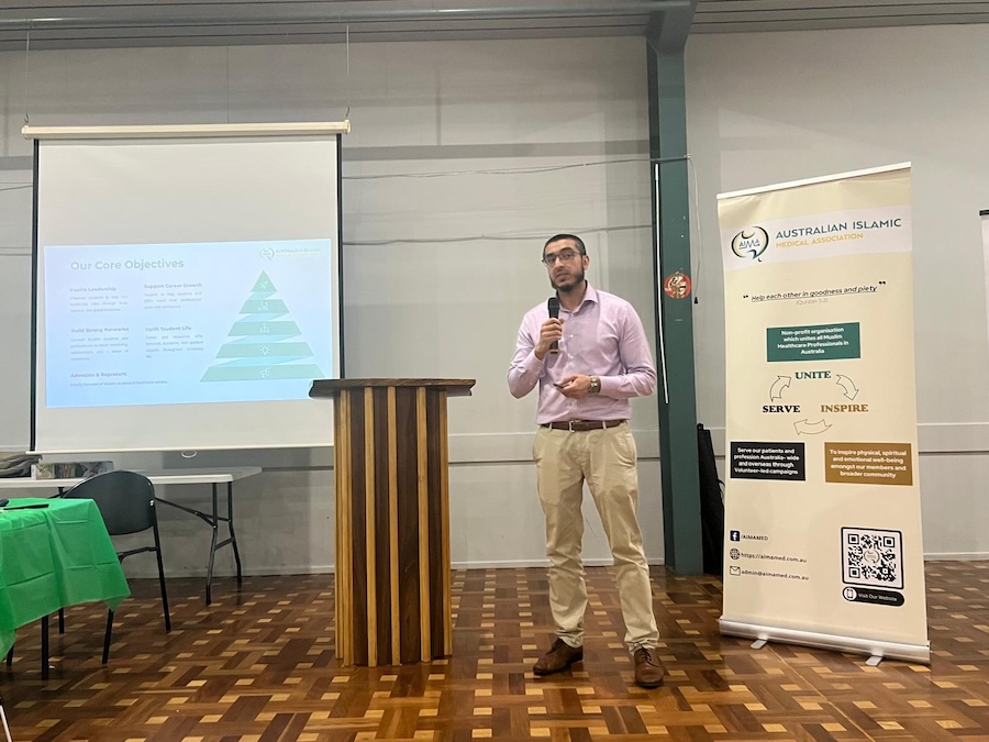 AIMA QLD Secretary and Student Lead Mustafa Hamimi then outlined the various programs and activities offered by the Student and Junior Medical Officer wing, detailing opportunities in networking, career development, and leadership training.